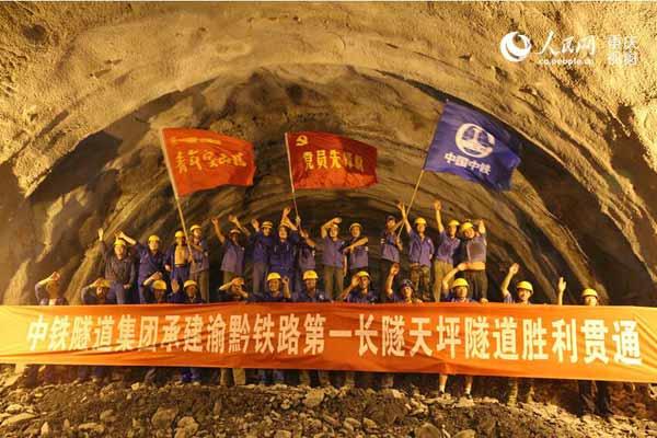 近日,在渝黔交界的尧龙山下,渝黔铁路第一长隧天坪隧道,经过中铁隧道集团建设者40个月的顽强攻坚提前贯通,这标志着渝黔铁路控制性工程取得重大突破。