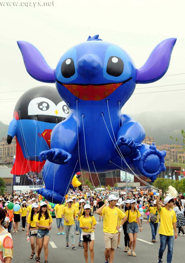 现场热烈的气氛深深地感染着游客们,很多游客带着小孩一边拍照、一边欢呼。现场一位姓杨的女游客介绍,早上在山上散步的时候,七岁的女儿看到空中飘着大气球,兴奋地拉着自己跑来观看。“女儿一直很喜欢看动画片,现场的卡通气球几乎都认识,都是迪士尼里面的动物明星,也是第一次看到这么多的巨型气球,娃儿特别兴奋,学着动物的表情姿势跟着跑,我们也觉得很新鲜,都抢到和气球合影。”
