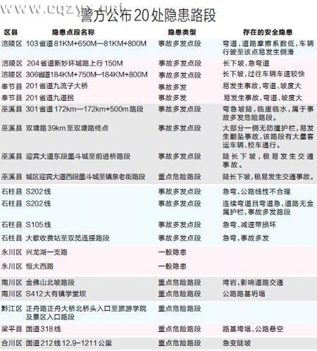 摘要: 中秋小长假即将来临,外出游玩或者回乡的市民注意了。昨日,重庆市交巡警总队公布了全市20处道路隐患路段,市民路过时请小心驾驶。