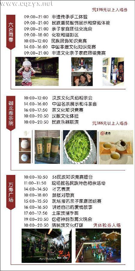 据介绍,本次活动以56个民族为元素,围绕传播56个民族喜庆文化,提升重庆人幸福指数的理念,聚焦各民族的婚俗、节庆、乐器、舞蹈、音乐、服饰、茶、酒、食品、特色美食等丰富多彩的文化元素。同时,将以‘体验舌尖上的民族美食’、‘指尖上的民族工艺’、‘心尖上的民族印象’三大主题推出12个专题系列活动,让重庆市民在吃喝玩乐行购游活动中体验民族文化。