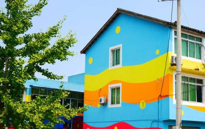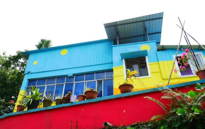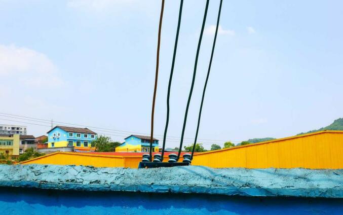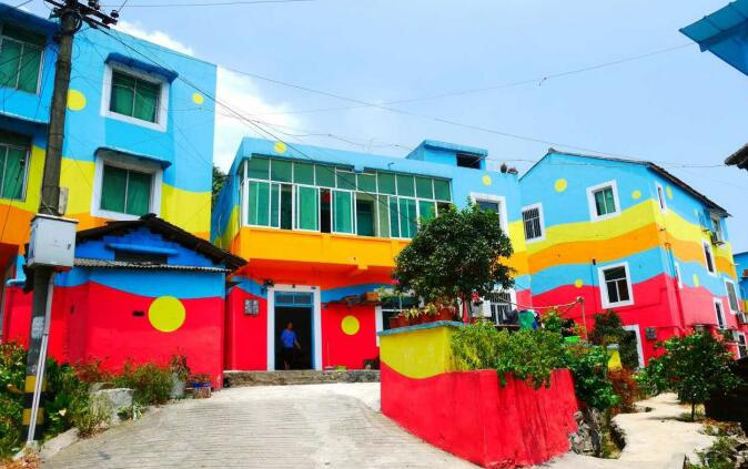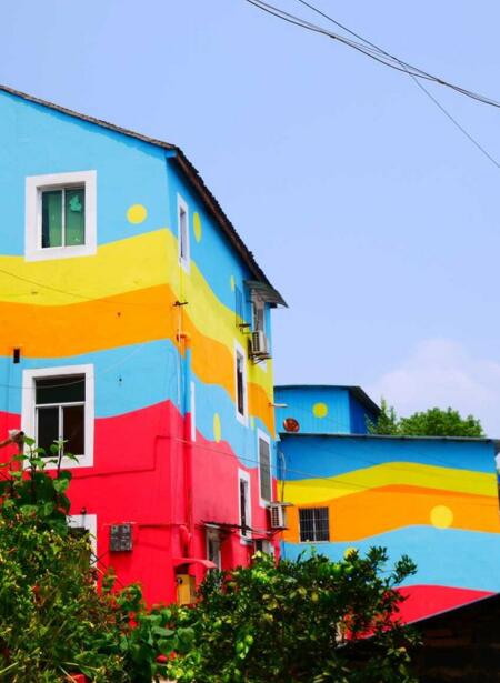 这是沙坪坝区建设“歌乐山国际慢城”过程中,在中梁镇特意打造的“五彩村庄”,共有153栋彩色房屋。“山高水长”主题房屋主要分布在茅山峡路。彩绘使用了水的流线型图案和浪花的圆形点状符号来表现主题。
