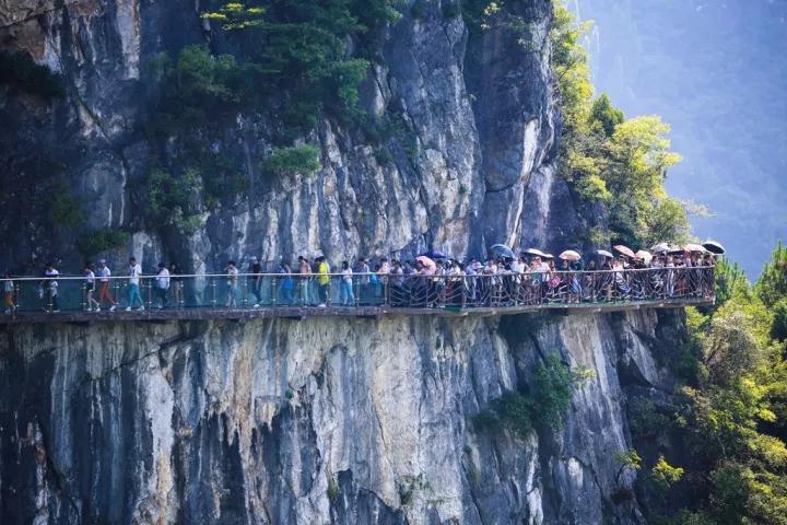 千变万变,连天栈道总是不变的等着你。距谷底垂直高度900余米,相当于300层楼高,宽1.5米,全长3500多米。给游客体验既惊险刺激,又感受到大自然的美丽和宁静。它以独特的地质奇观和险要的观光体验,成为龙河湿地的点睛之笔,游客在饱龙河峡谷秀美风光的同时,亦可体验探险的乐趣。