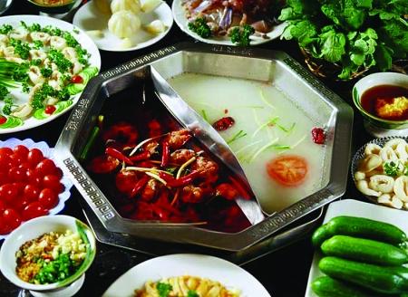 重庆最富胜名的就要数火锅,据说火锅起源因于潮冷的冬季气侯和重庆人爽快率直的性 格。从今天街头鳞次栉比的火锅店可以看出火锅市场的兴旺。重庆火锅主要分为红汤和清汤两种,红汤以麻辣鲜香为主,而清汤以色清味鲜为特色。鸳鸯火锅就是这二者的结合体,即火锅用S形的金属片分格成太极图状,一清一红,颜色分明。外地人在重庆喜欢 吃鸳鸯火锅,要是吃红赖挡不了,马上请清汤救驾。本地人的最爱大概要算街边的大排挡火锅(又称麻辣烫)了。至于油碟,重庆人喜用麻油拌蒜泥,一来清热降火,二来调味润滑, 于是吃起更加回味悠长。记得我读大学时有位来自江苏的同学,一日初尝火锅,立刻被 辣得语不成句:“好辣呀,好辣呀......辣死了......好好吃哟!......我还要吃.... ..",可见火锅的魅力无穷。这不,前两天他还打电话给我让我寄几袋火锅底料去。