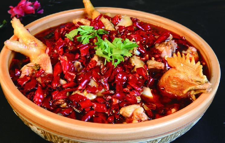 鸡在重庆的吃法繁多:口水鸡,结合了卤味和白斩鸡的优点;辣子鸡,在大堆的干辣椒 里埋了大量的鸡丁,不仅要好眼力,还要好肠胃;烧鸡公,既象泉水鸡,有兼有火锅的 风格(两个白色卵形物很补人哟!:-) )...... 泡凤爪也很好吃。平常家里一般是把凤爪煮熟后放进泡菜坛里浸半天取食,但泡菜味较 重,我不大喜欢。经比较,发现有友出品的袋装凤爪很不错,凤爪先斩细,再用糟辣子 和多种调料腌制,胶质和骨头尽数入味。既有泡的风味,又不掩饰凤爪的本味,而且耐 品。我很多外地朋友吃后都赞不绝口,更有文静小姐连食六袋的“骄人”记录。这种泡 凤爪在家乐福和很多小店都有得卖。
