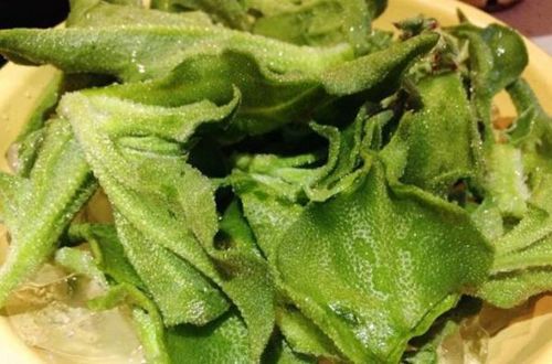 冰菜看上去很像蓬蒿,浑身附满了“冰珠子”,用手摸上去又凉又硬。蘸着沙拉酱吃,酸酸咸咸的,口感独特。爱吃的人一吃就停不下来!