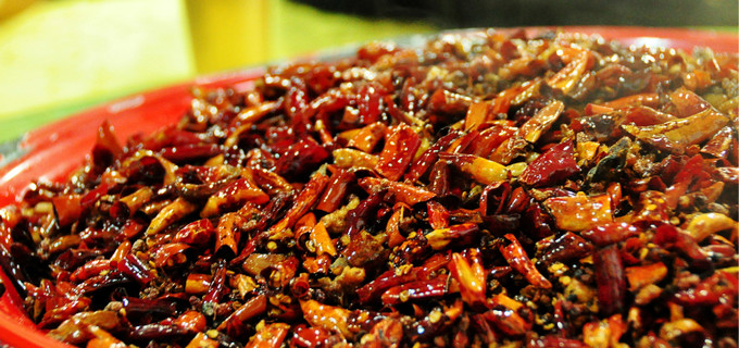 炸得焦香的仔鸡块,害羞地藏在红红的辣椒下,好似在跟你玩捉迷藏,边找边吃,乐趣多多。