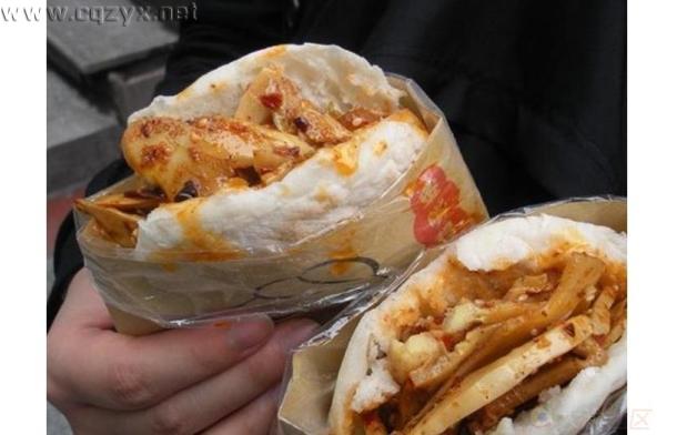 首先,第一种就是在沙坪坝三峡广场开了十几年的知名的金嘴锅盔。它的历史可还不短呢,开始于1998年。它是中间夹杂着夫妻肺片的一些东西的像汉堡一样的锅盔。中间是散的,无法切,只能整个一起吃。这家锅盔好吃的地方就是在于里面夹的凉拌馅儿,有夫妻肺片等。