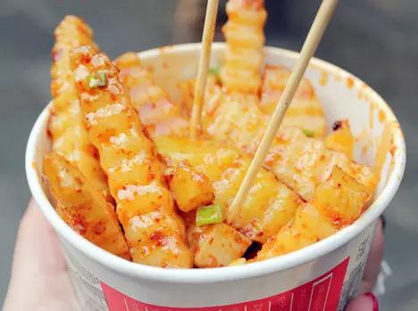 重庆街头随处可见的小吃狼牙土豆,不会过于软嫩,这可比麦当劳的薯条畅销,现炸现卖。