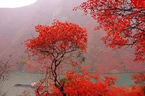 巫山红叶品种多样,观赏时间长。当船只行进在小三峡中,站在船上看两岸山上万山尽红、丛林尽染,真是美不胜收。
