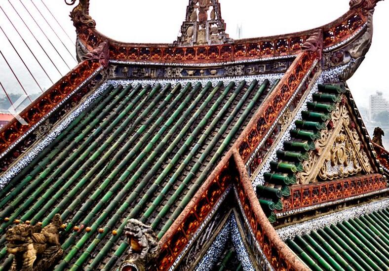 湖广会馆的围墙样式,是明清时期常见的黄色封火墙,以直线构图而呈阶梯状叠落,又称“码头墙”,是典型的江南建筑风格。这样的设计,使整个湖广会馆呈“L”形,从山坡上直冲而下,围墙联绵不断,造成异常震撼的视觉冲击。湖广会馆的屋顶造型华丽,配上琉璃瓦、精心雕刻的山花与大气的脊兽,组合协调大气,至今鎏光溢彩,成为一幅幅令人赏心悦目画面。新华网 黄俊辉摄 飞手 向进