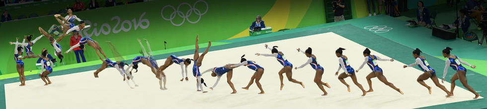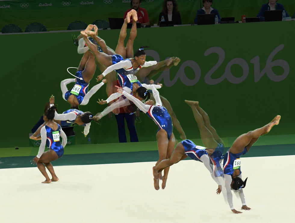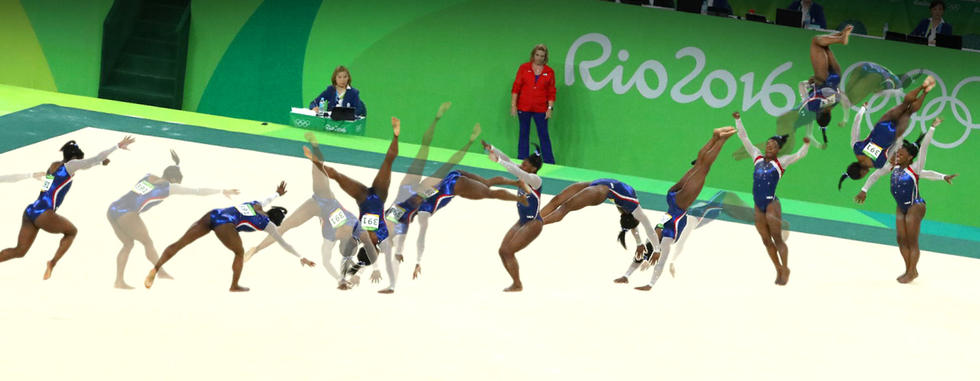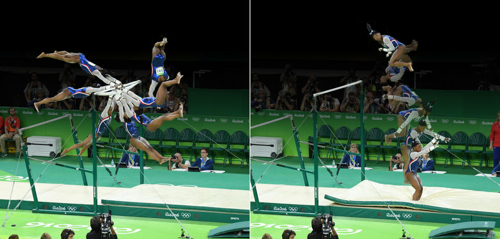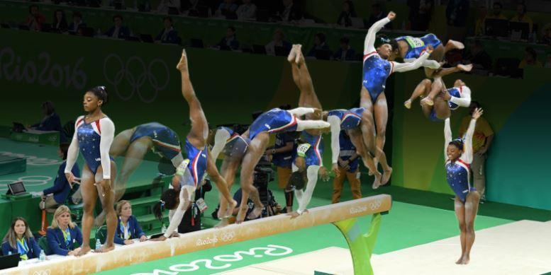 图为里约奥运会西蒙在平衡木上的精彩动作。在奥运会上,尽管有一点失误,西蒙还是得到了平衡木的最高分。她完成了两个后手翻和两个转体。