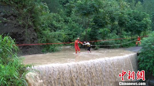在距离被困人员约3公里远的山脚下,消防官兵遇到洪水淹没路面,警车也无法通过。消防官兵立即架设绳索,在洪水中搭起救援通道,两名官兵抓着绳索从湍急的水流中艰难前行,通过被淹没的路段,再乘坐当地村民的摩托车上山救援接应被困人员。