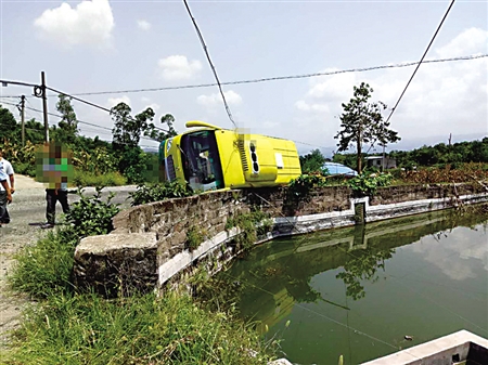 8月10日,成都一名旅游包车司机载着17名游客来渝北旅游遭遇途中堵车,他连续驾车5小时仍未停下来休息,终因疲劳驾驶引发车辆发生侧翻事故。幸运的是,该车侧翻时被旁边堰塘的围墙挡住,7名乘客仅受轻伤。如果一旦坠入2米多深的塘中后果难料。昨天,渝北区交巡警支队判定该客车司机承担事故全责,记12分、罚款200元,他的驾照被降为B2级。