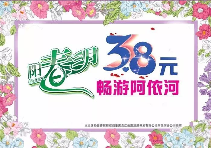 3.8妇女节的到来,四海八荒都在搞活动!当然,我们阿依河也不能落下。这次我们妇女节推出四个优惠活动而且3.8日当天还有有奖趣味游戏,更多好礼等着你哟!快跟着重庆自由行小编一起去看看有没有你心仪的活动!
