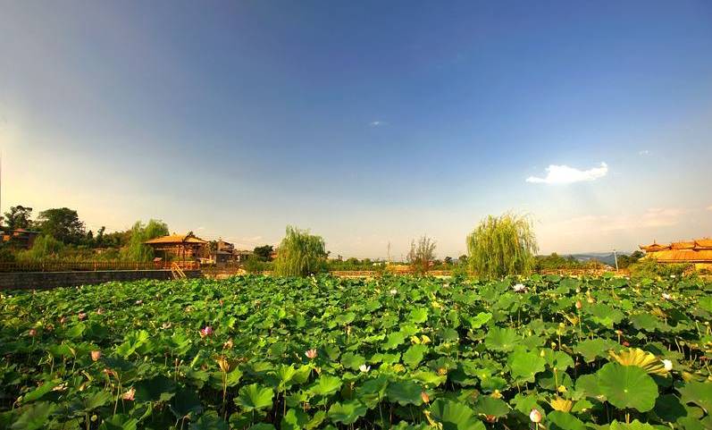 荷韵园有着一大片荷花地,荷叶碧连天,天晴时的蓝天绿叶,总能让人心旷神怡。