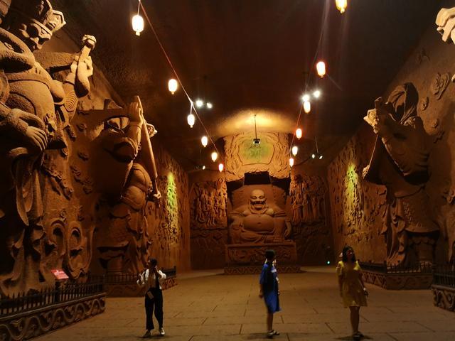特别是那辉煌的地宫佛像雕塑群,宏伟壮观,光是展示在投影仪上就足以震撼人心,地宫内的巨型石雕:佛祖、四大天王、千手观音、布袋和尚、33米巨型坐佛、51米药师佛、八百罗汉等等,皆是大工程,如此巨大的工程,完全采用摩崖造像雕刻技术,是雕刻师用凿子,一锤一锤凿出来的,而且是一次成型,不能失败,在20年前是怎么完成的?不由得让人联想到中国四大石窟的打造过程,不知道当时的工人们付出了多少的心血。