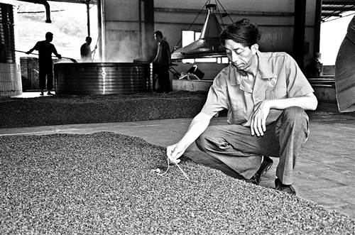 “在现代科技发达的今天,我们仍然采用传统工艺,来保证酒的品质,这也是企业经久不衰的关键。”赵新国说,用40至45度热水闷粮,闷粮时水淹过粮面12厘米左右,闷20分钟后,检查高粱吸水情况,要求吸水均匀,90%开始裂丝线口,不顶手,这时即可放掉闷水。”