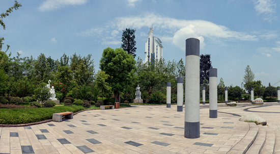 穿过花木扶疏的园区道路,就是“义渡广场”,眼前的景色顿时开阔,横跨长江的马桑溪大桥,像两架巨大的竖琴,矗立在画面的中央。