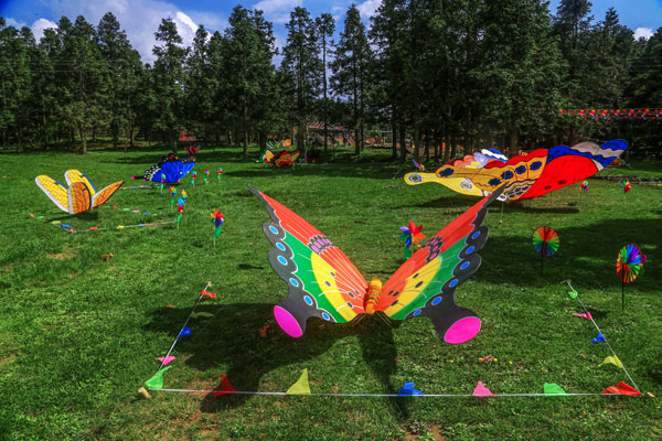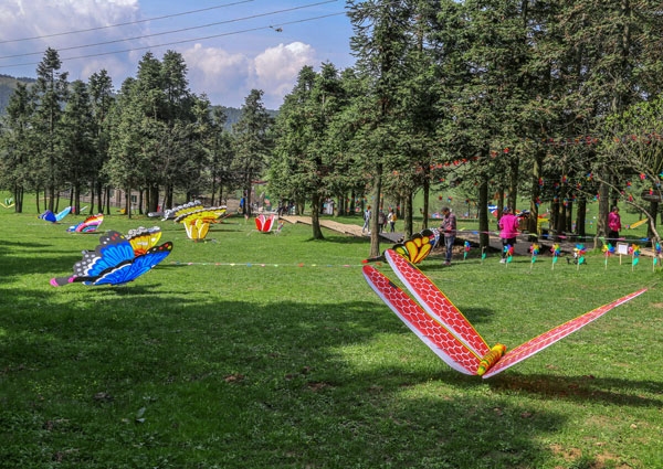 仙女山历届国际风筝季都在景区氛围包装上不断的推陈出新,本届更是以“风筝童话王国”为主题,在大草原布置了各种大型人形卡通风筝、各色落地小风车、蝴蝶风筝、蜻蜓风筝等风筝元素,并打造了千米风车长廊供游客观赏拍照。
